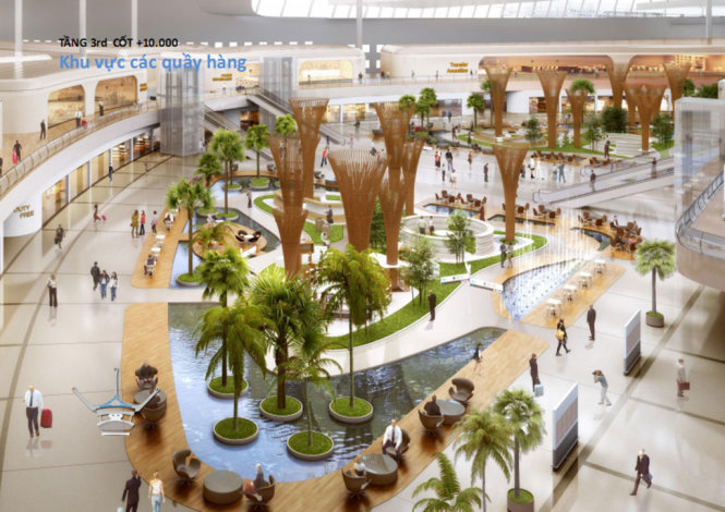 Theo thuyết trình thì nhà thiết kế muốn có hình ảnh một nhà ga hàng không đậm chất văn hóa địa phương. Bên trong ga đi, các quầy hàng được thiết kế như những con thuyền di chuyển trên sông nước đồng quê.